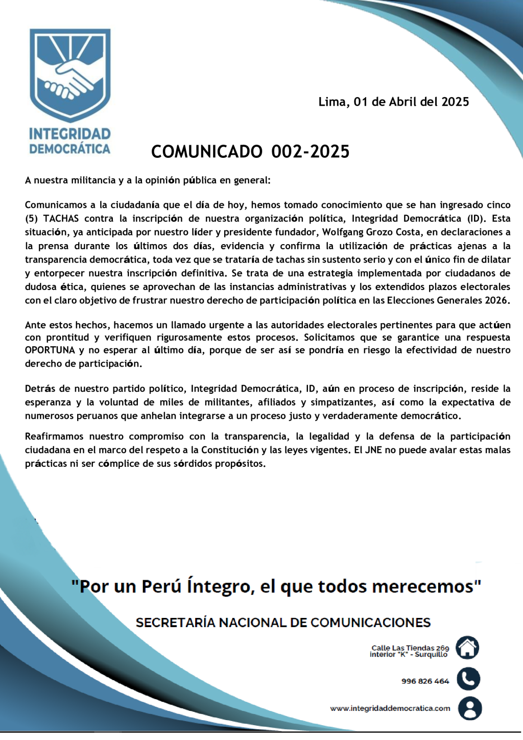 Mediante un comunicado, la Secretaría Nacional de Comunicaciones de la agrupación política Integridad Democrática denunció la existencia de prácticas irregulares destinadas a obstaculizar su inscripción como partido político ante el Jurado Nacional de Elecciones (JNE).