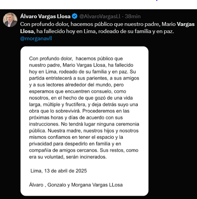 El novelista peruano Mario Vargas Llosa ha fallecido este domingo en Lima, según han informado sus hijos Álvaro, Gonzalo y Morgana en un comunicado. Nacido en Arequipa el 28 de marzo de 1936, el premio Nobel de literatura de 2010 acababa de cumplir los 89 años. Autor de obras fundamentales como Conversación en La Catedral, La ciudad y los perros o La fiesta del Chivo, fue uno de los escritores más importantes de la literatura contemporánea en cualquier lengua. Novelista, ensayista, polemista, articulista y académico, Vargas Llosa pasará a la historia como un extraordinario narrador y un influyente intelectual a la antigua usanza, es decir, anterior a las redes sociales.