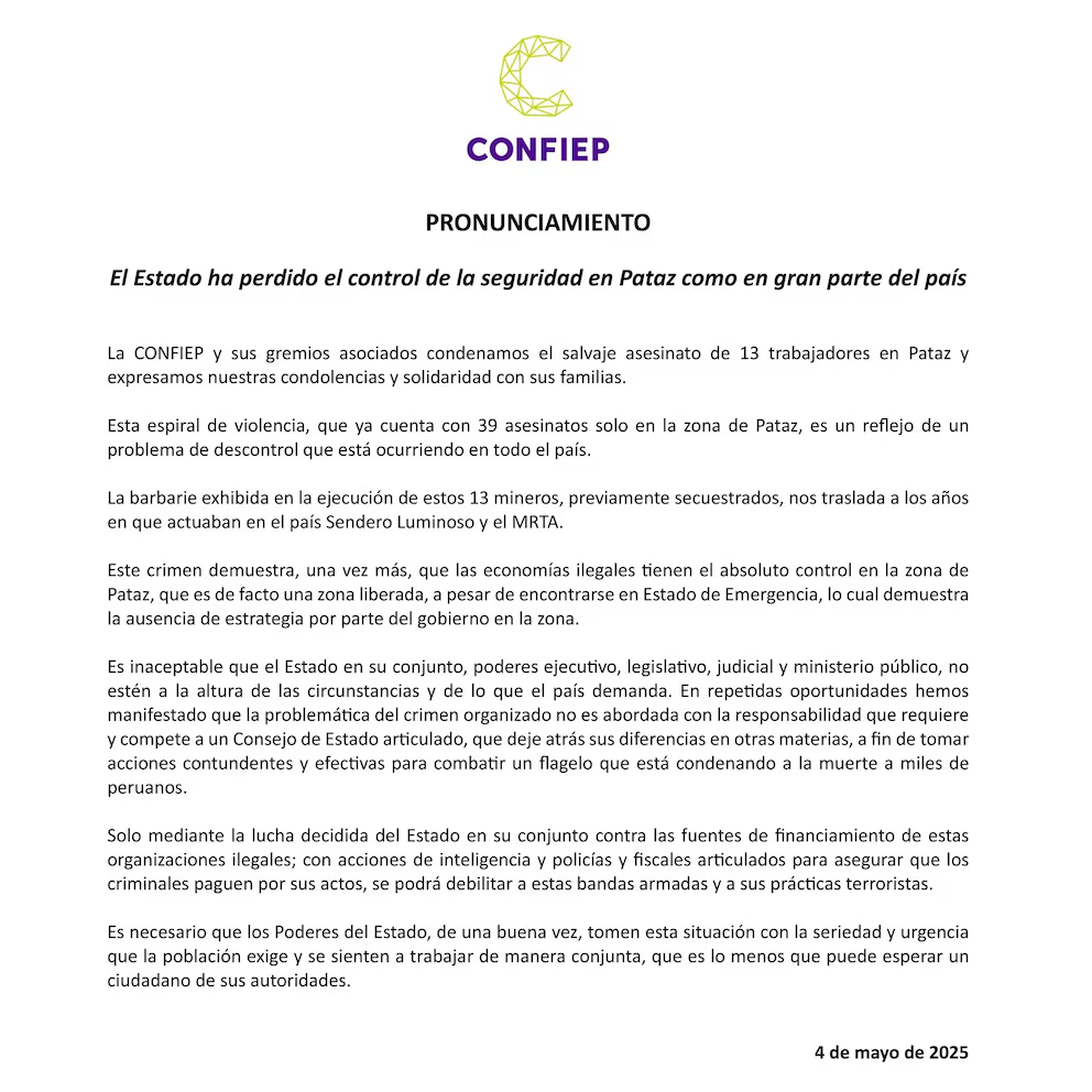# REACCIONES ANTE ASESINATO DE TRABAJADORES MINEROS EN PATAZ